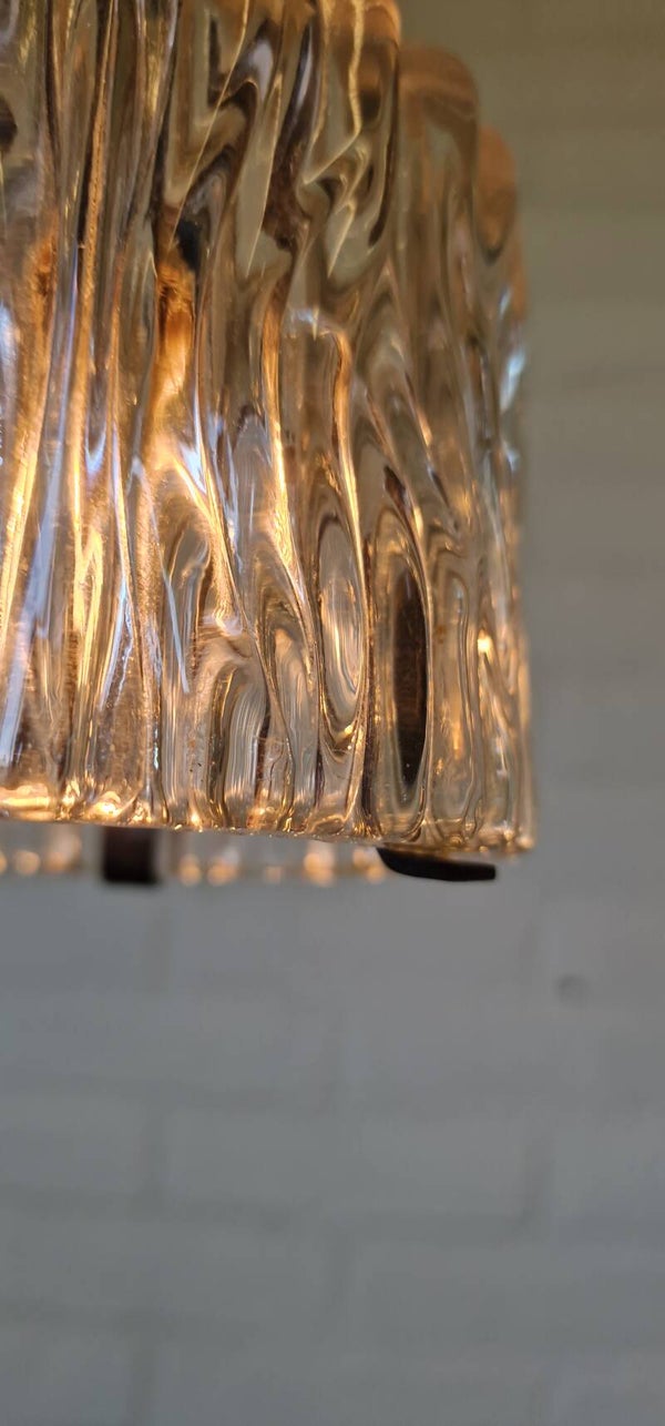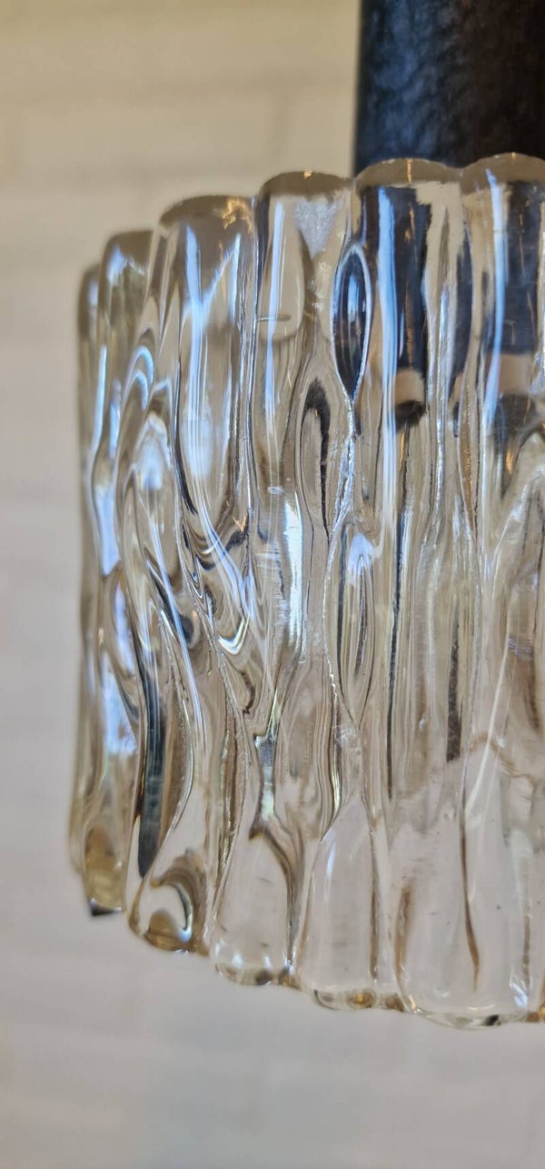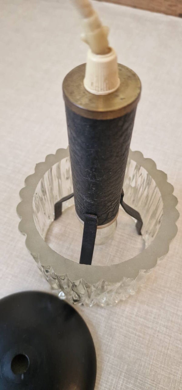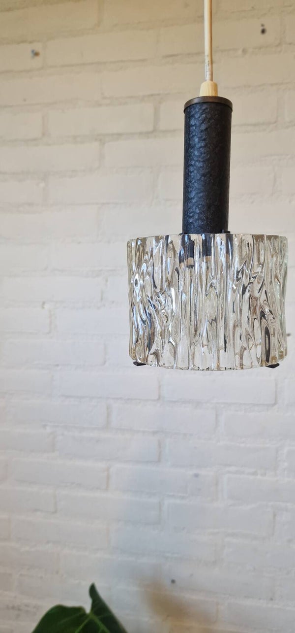 Een leuk vintage hanglampje, klein model, uit de jaren '50/60. Het bestaat uit een mooie ice-glass kelk die op een zwart metalen houder ligt. Dit geeft super mooi licht. De houder is aan een gemoffeld zwart armatuur bevestigd, die het geheel een strak uiterlijk geeft.