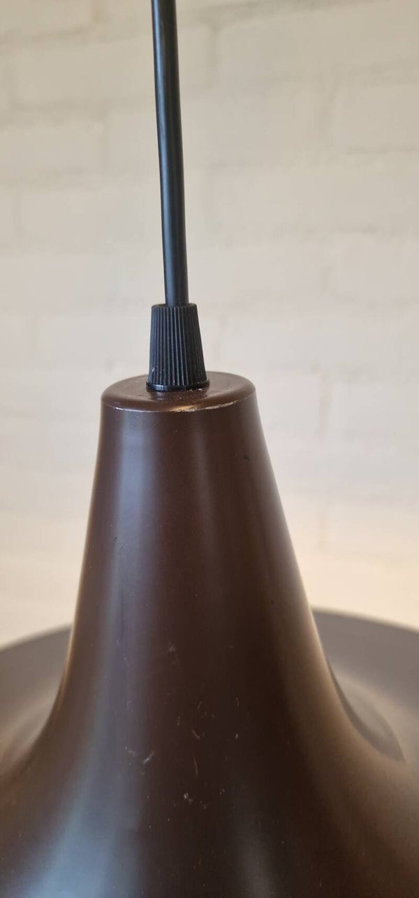 Mooie vintage hanglampen uit de jaren '70, waarschijnlijk van Dijkstra (niet gelabeld). De bruine kappen zijn aan de binnenkant wit, waardoor ze een optimale reflectie geven. Ze zijn voorzien van nieuwe bedrading.