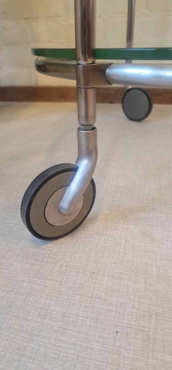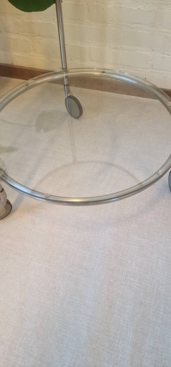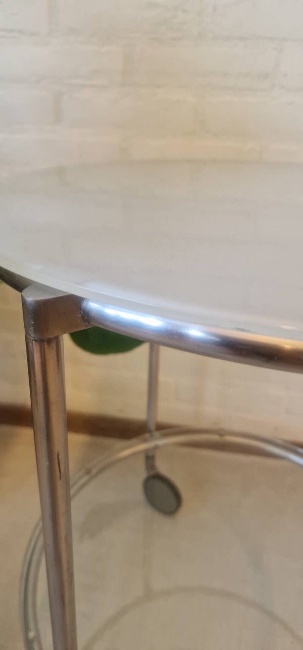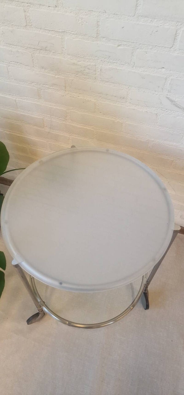 Een vintage IKEA Strind bijzettafel ontworpen door Ehlén Johansson, met een verchroomd metalen frame en twee ronde glasplaten, één van matglas en de ander is doorschijnend staand op 3 wieltjes.