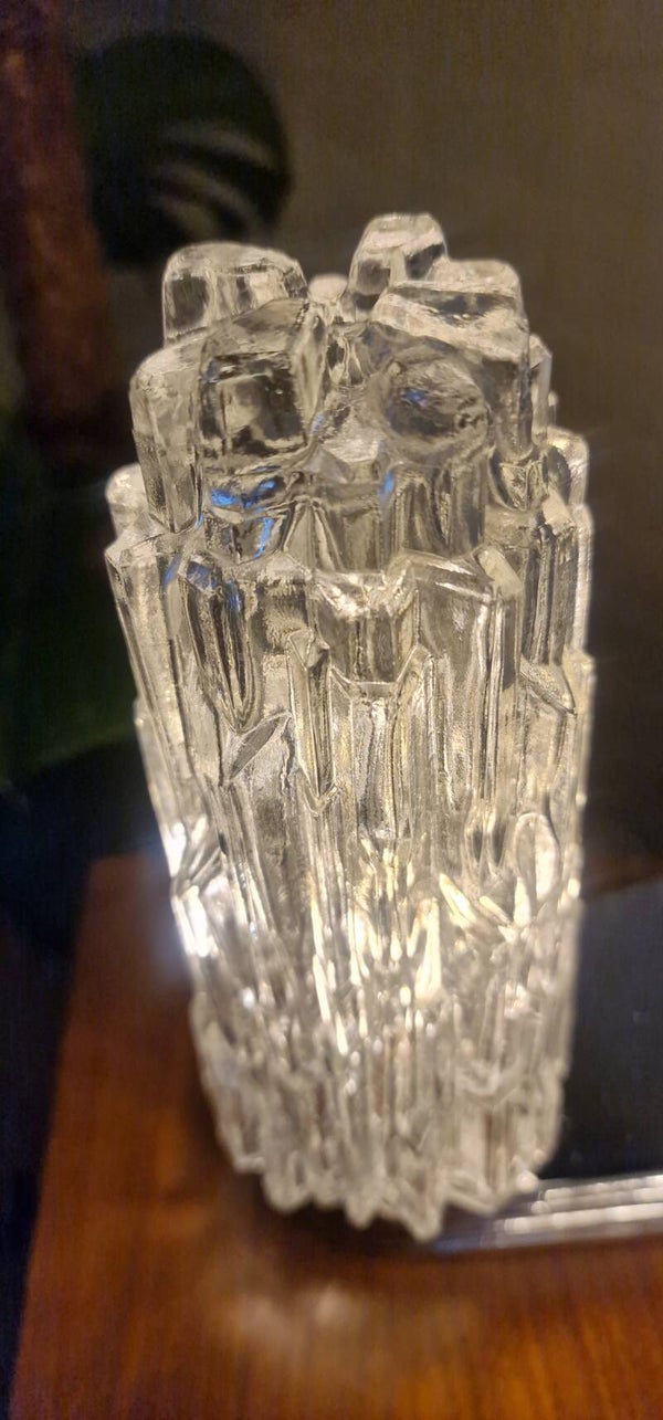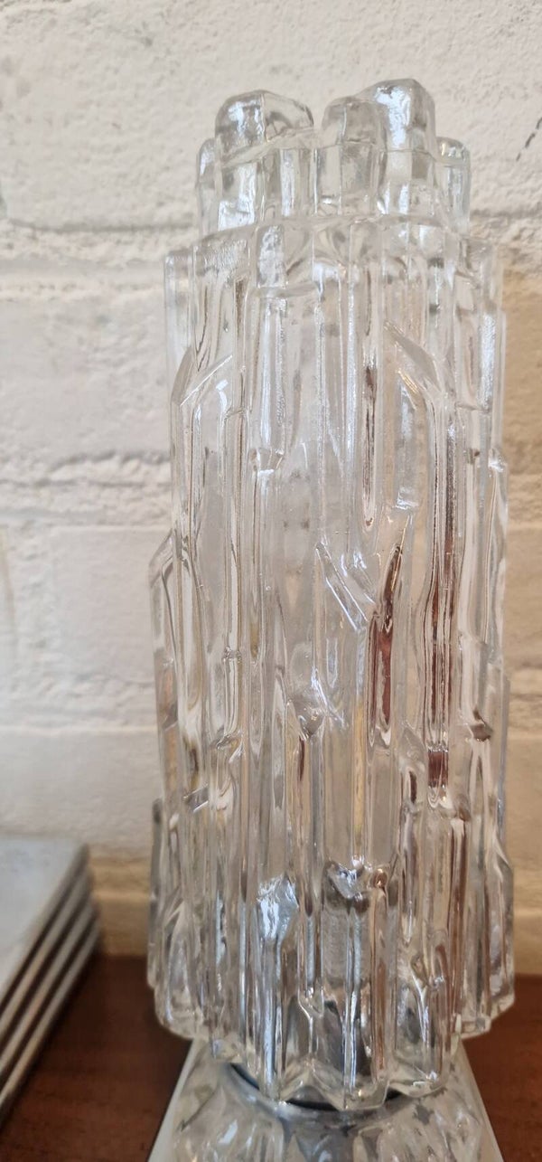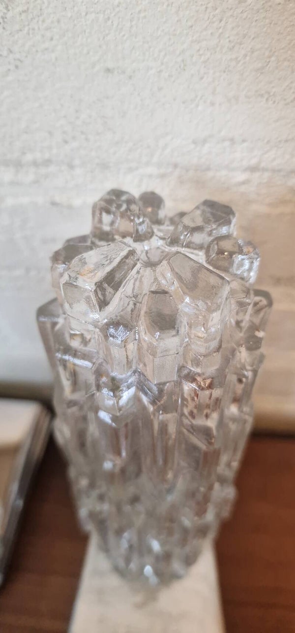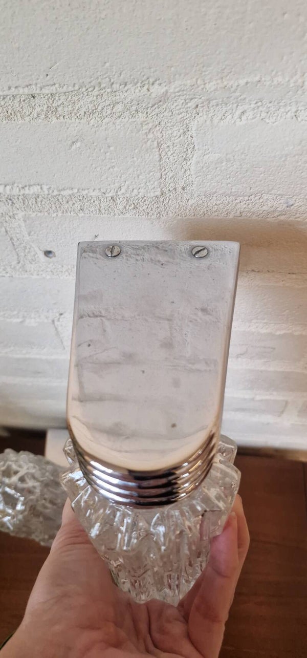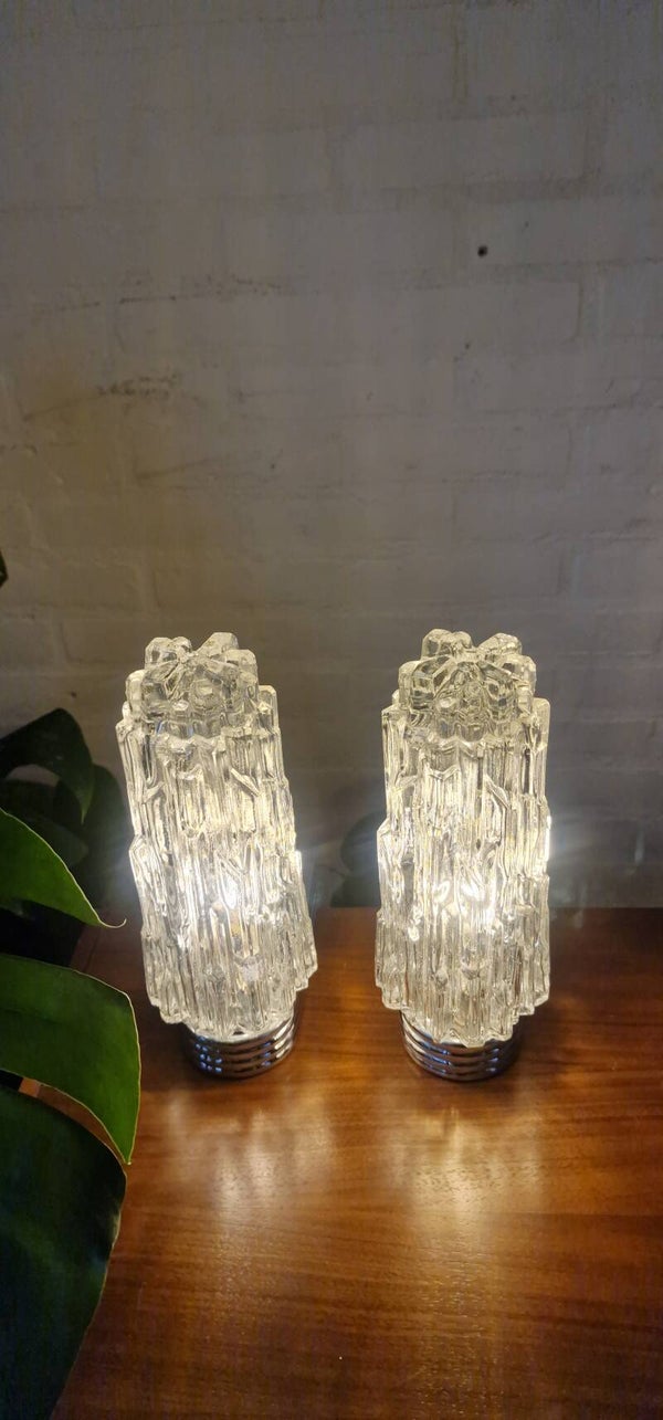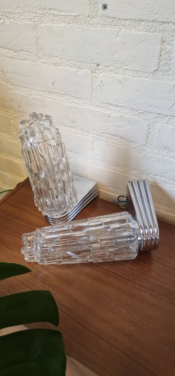 Een set Duitse Hoffmeister ICE-berg wandlampen uit de jaren '70 met een verchroomd kunststof frame en heldere ijspegelkap. De glazen kappen hebben een mooie textuur en lopen taps toe van boven naar onder, waardoor je een hele prachtige vorm krijgt. Stijlvol en functioneel.