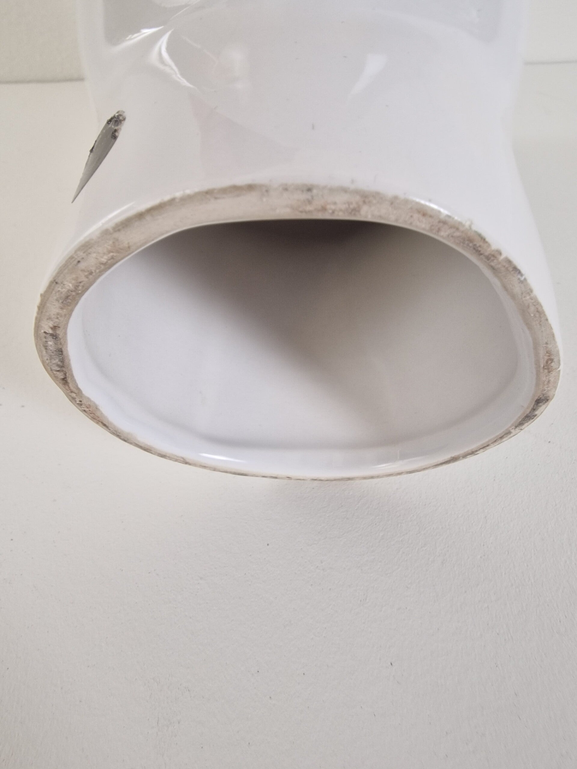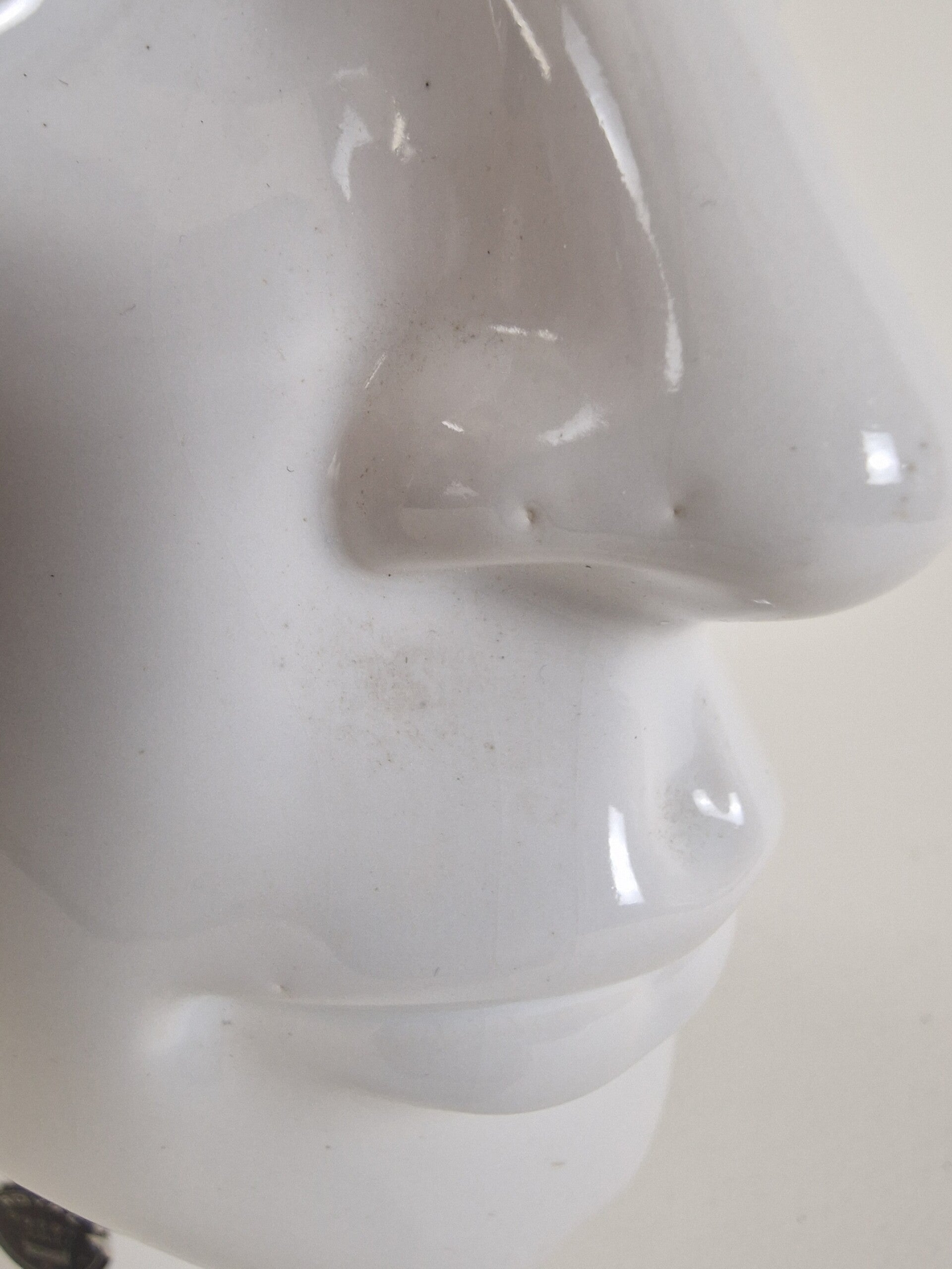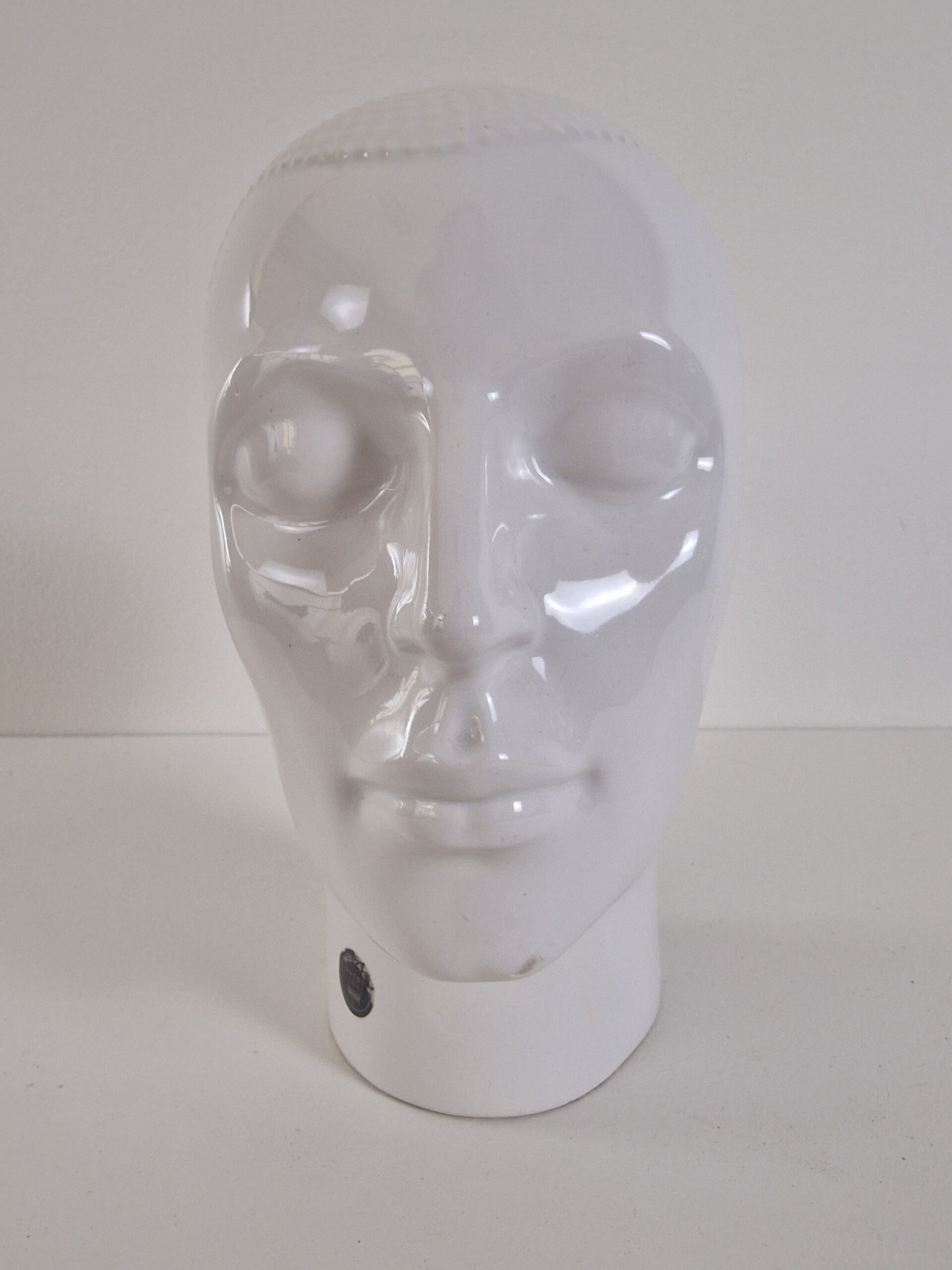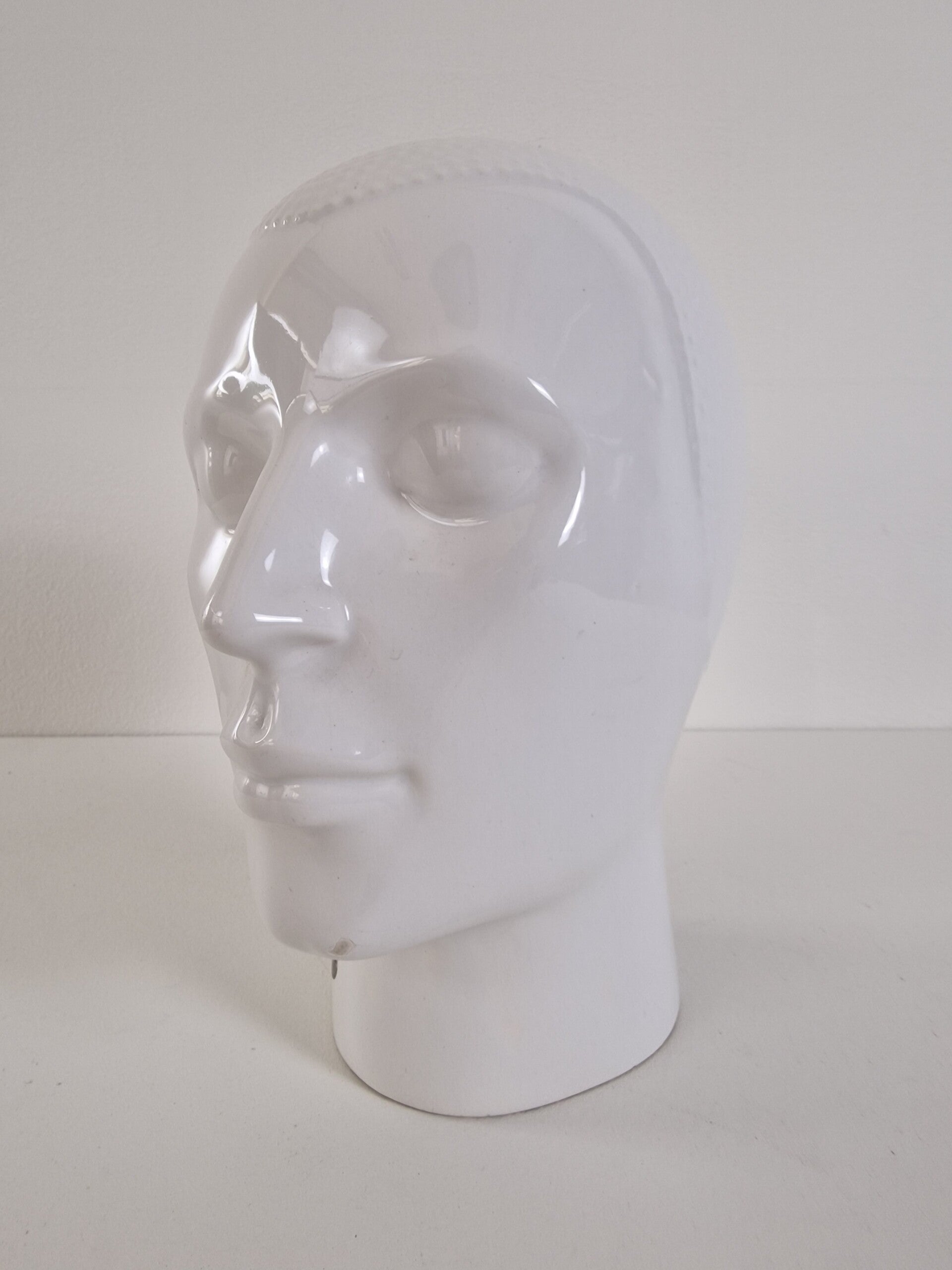 Een vintage wit geglazuurd aardewerk hoofd van Koninklijke Porceleyne Fles (Royal Delft) uit de jaren 70, oorspronkelijk gebruikt als mannequin voor koptelefoons, brillen of hoeden in winkels.
