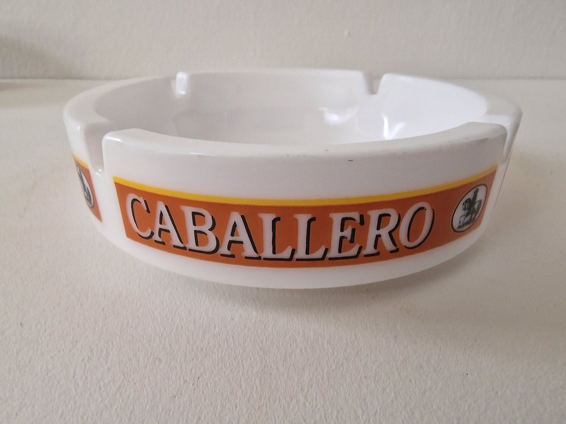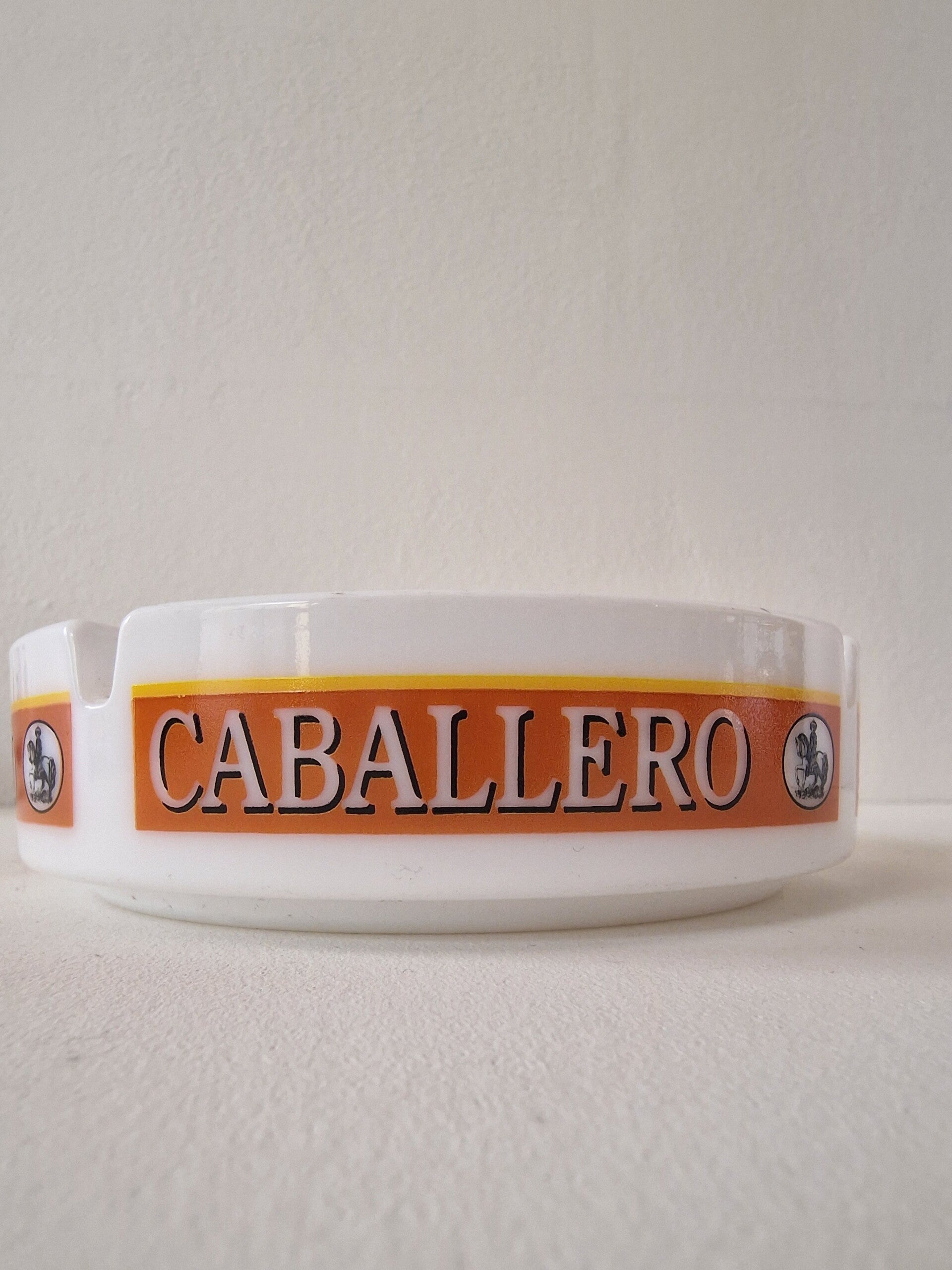 Een vintage keramische asbak van het tabaksmerk Caballero. Wit met een oranje en zwarte band voorzien van het Caballero-logo.