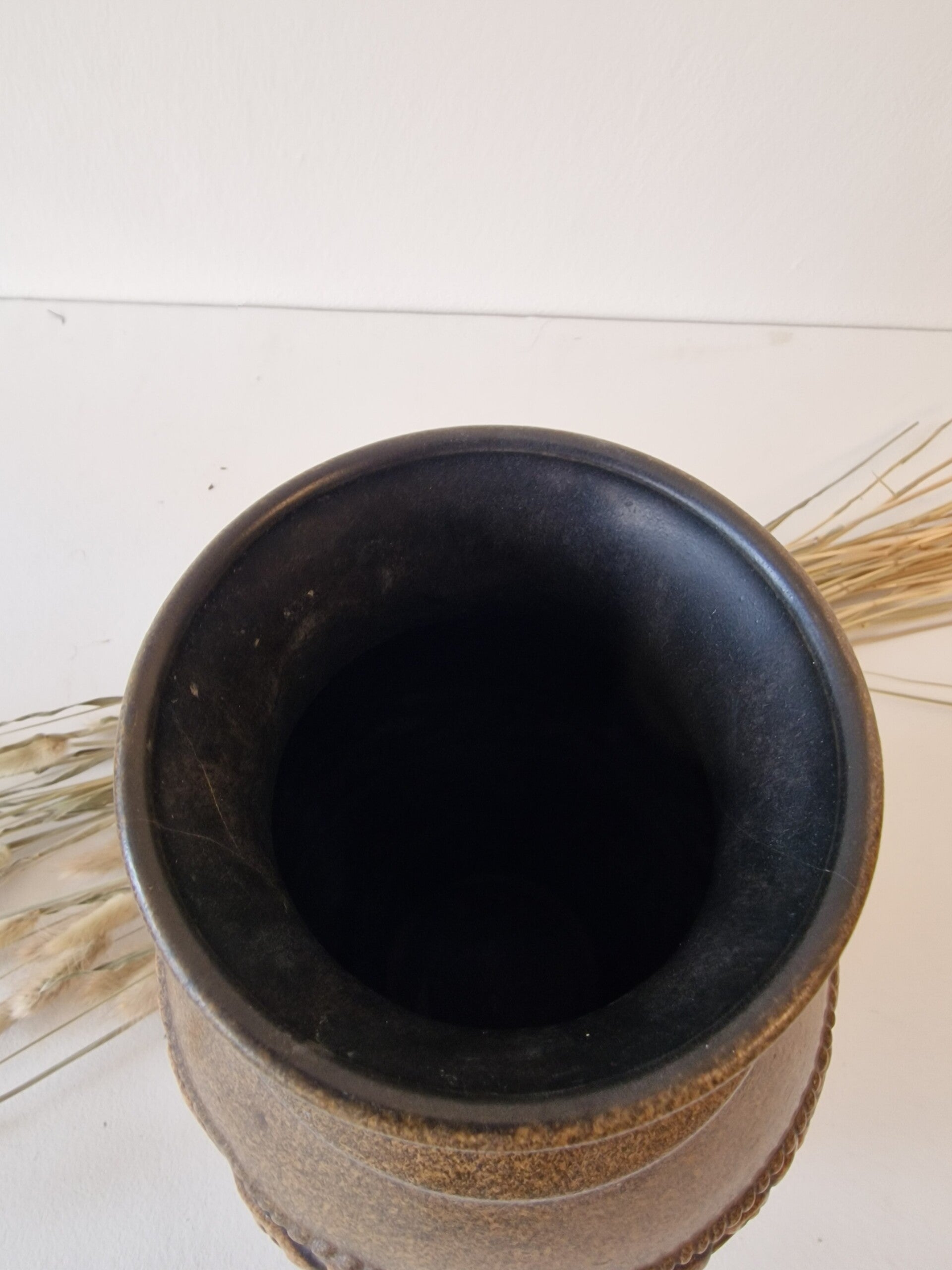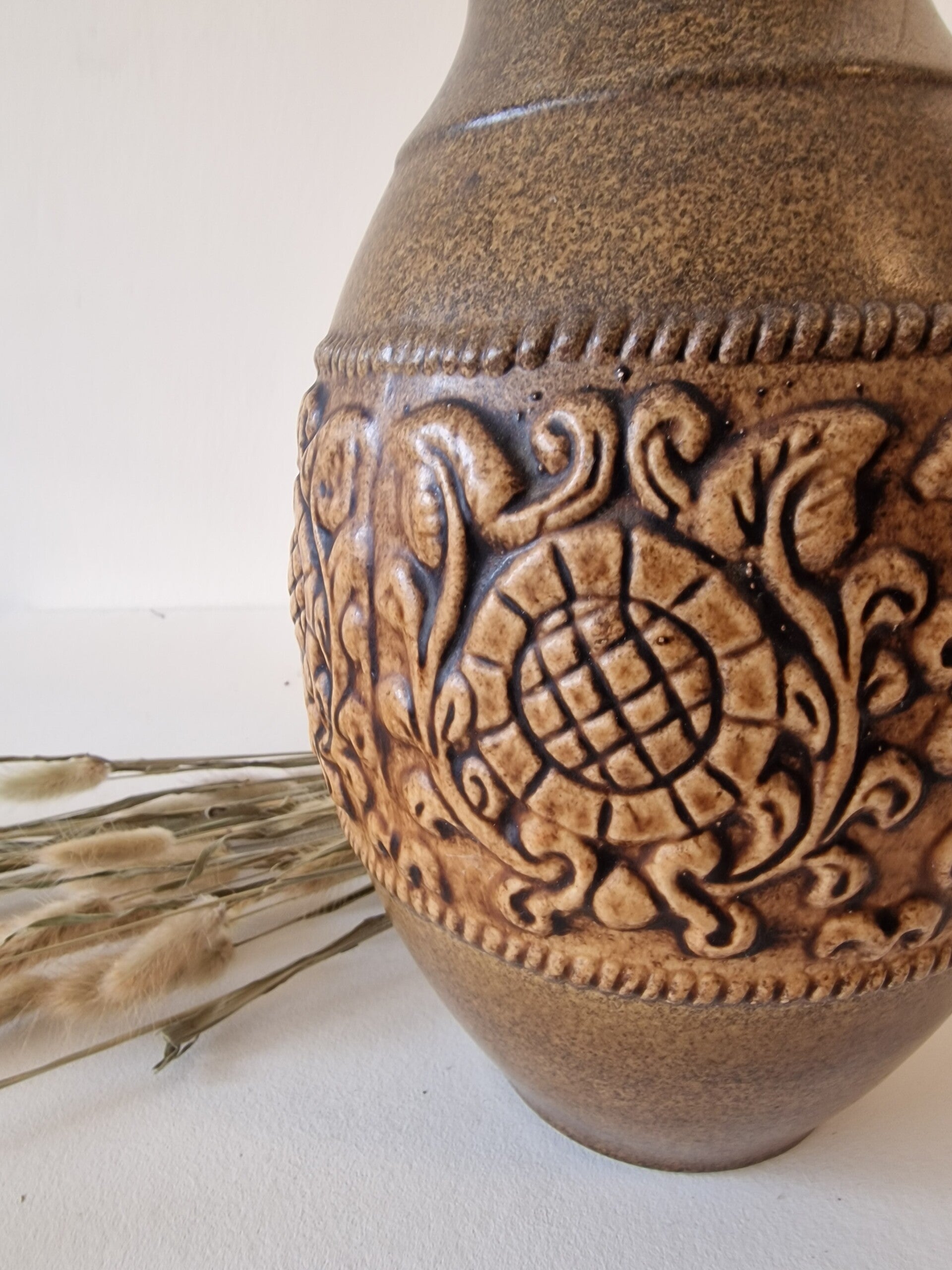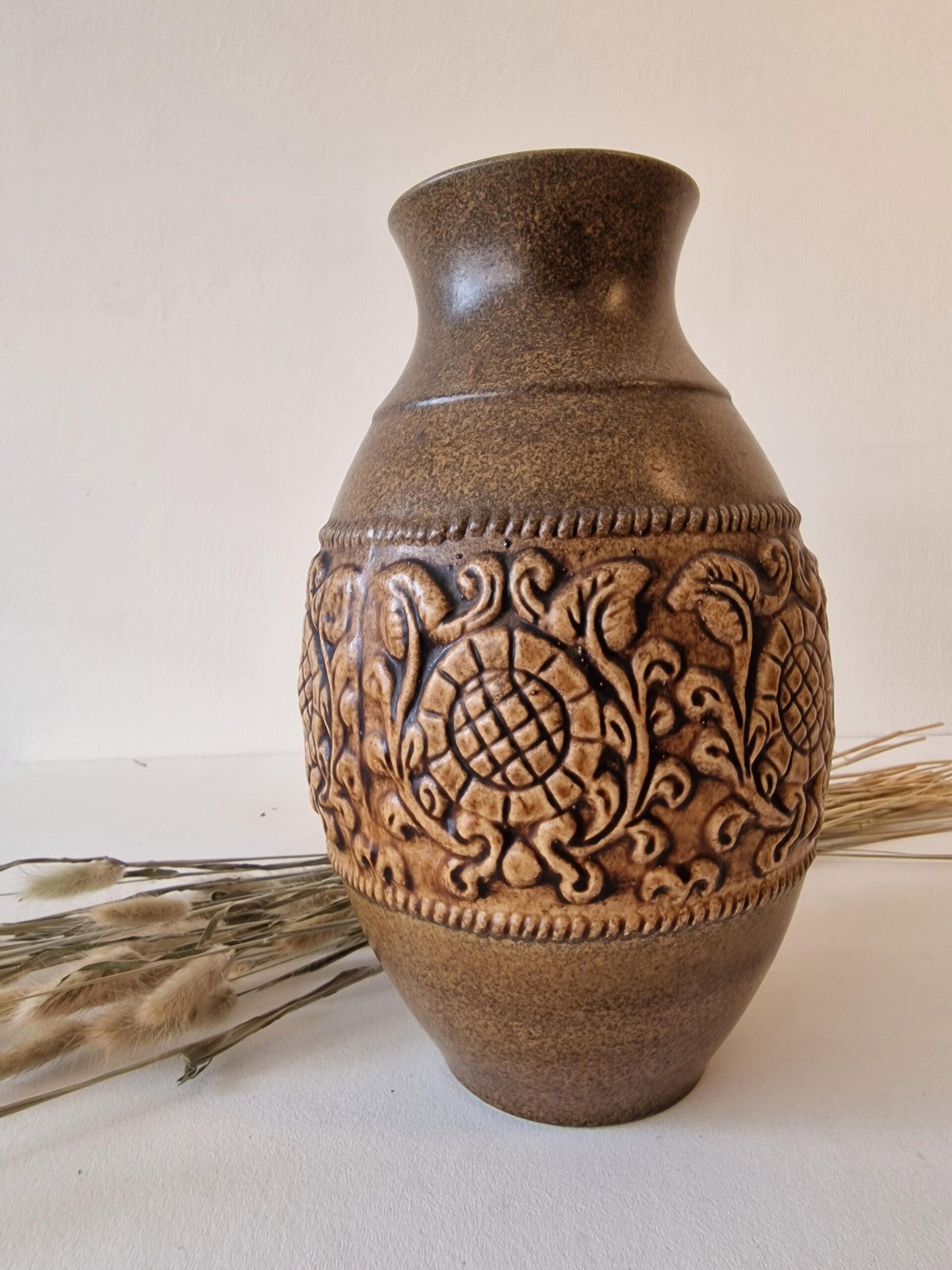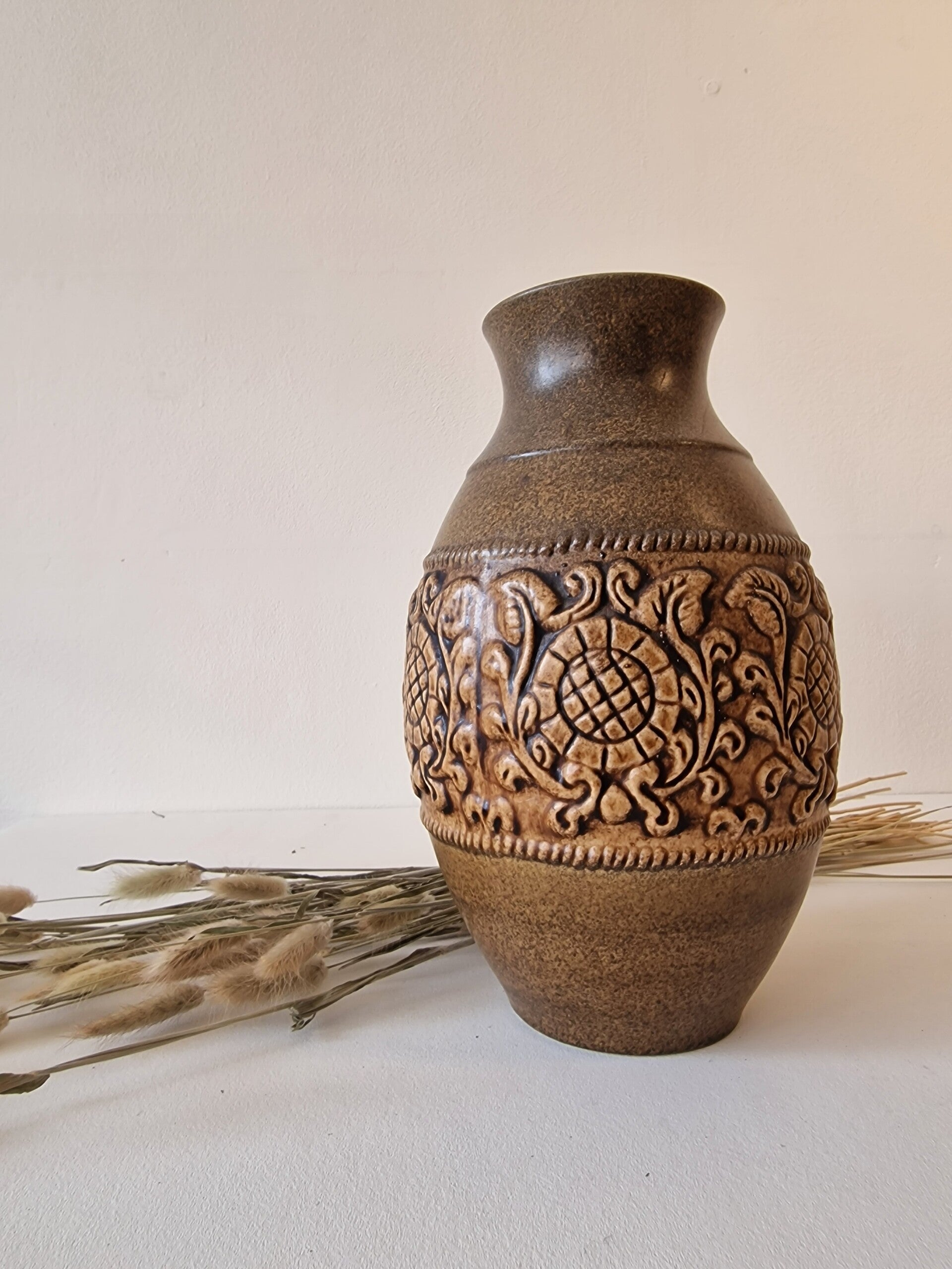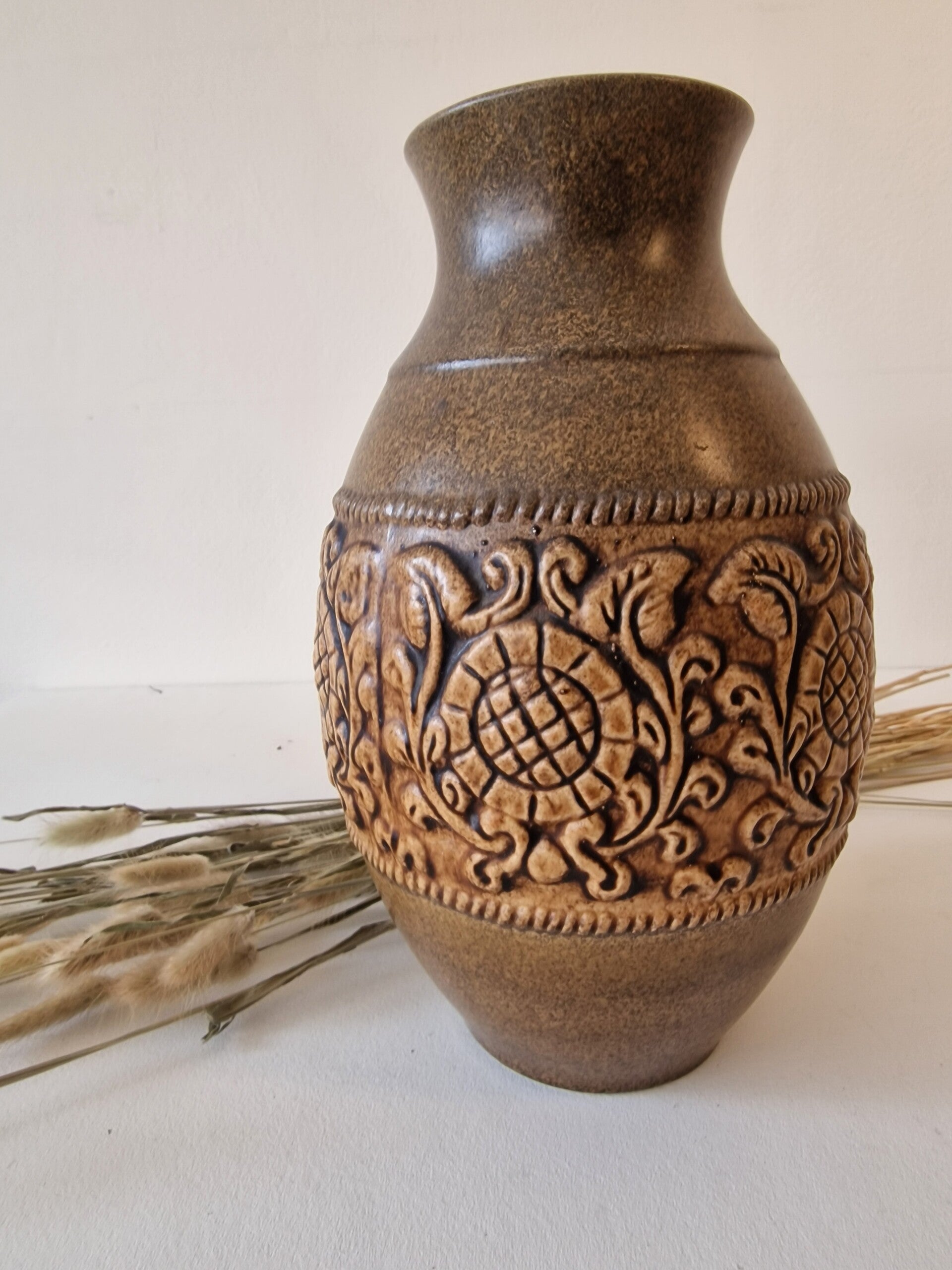- Kenmerken: De vaas heeft een aardse, bruine glazuurlaag en een dik reliëf dat kenmerkend is voor de Mid-Century Modern stijl. [1, 5]