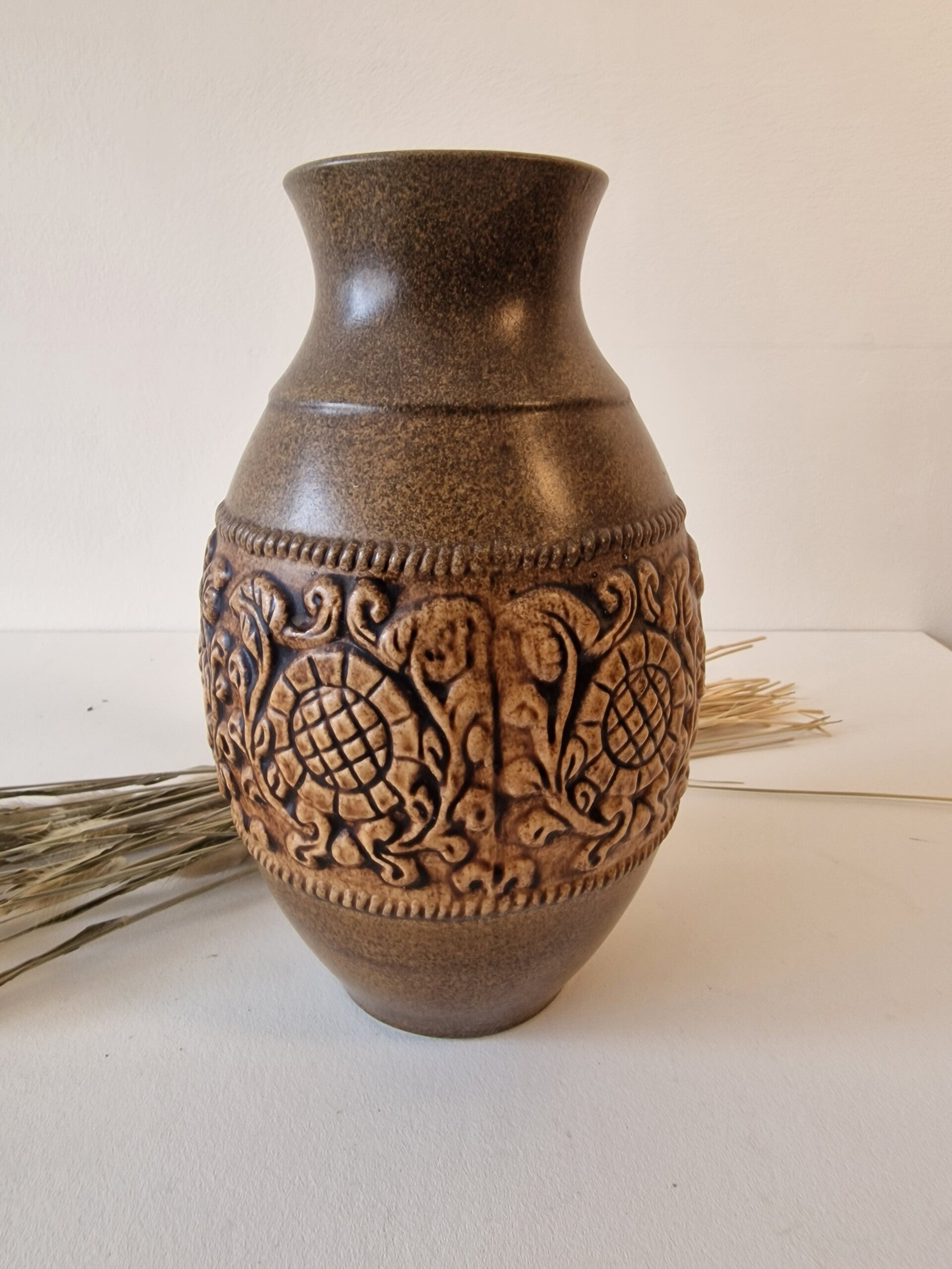 Deze vaas is een vintage keramisch stuk van de Duitse fabrikant Jasba, gemaakt in West-Duitsland (ca. jaren '60/'70). Het ontwerp staat bekend om zijn gedetailleerde reliëf met bloemmotieven, vaak aangeduid als het "zonnebloem" decor.