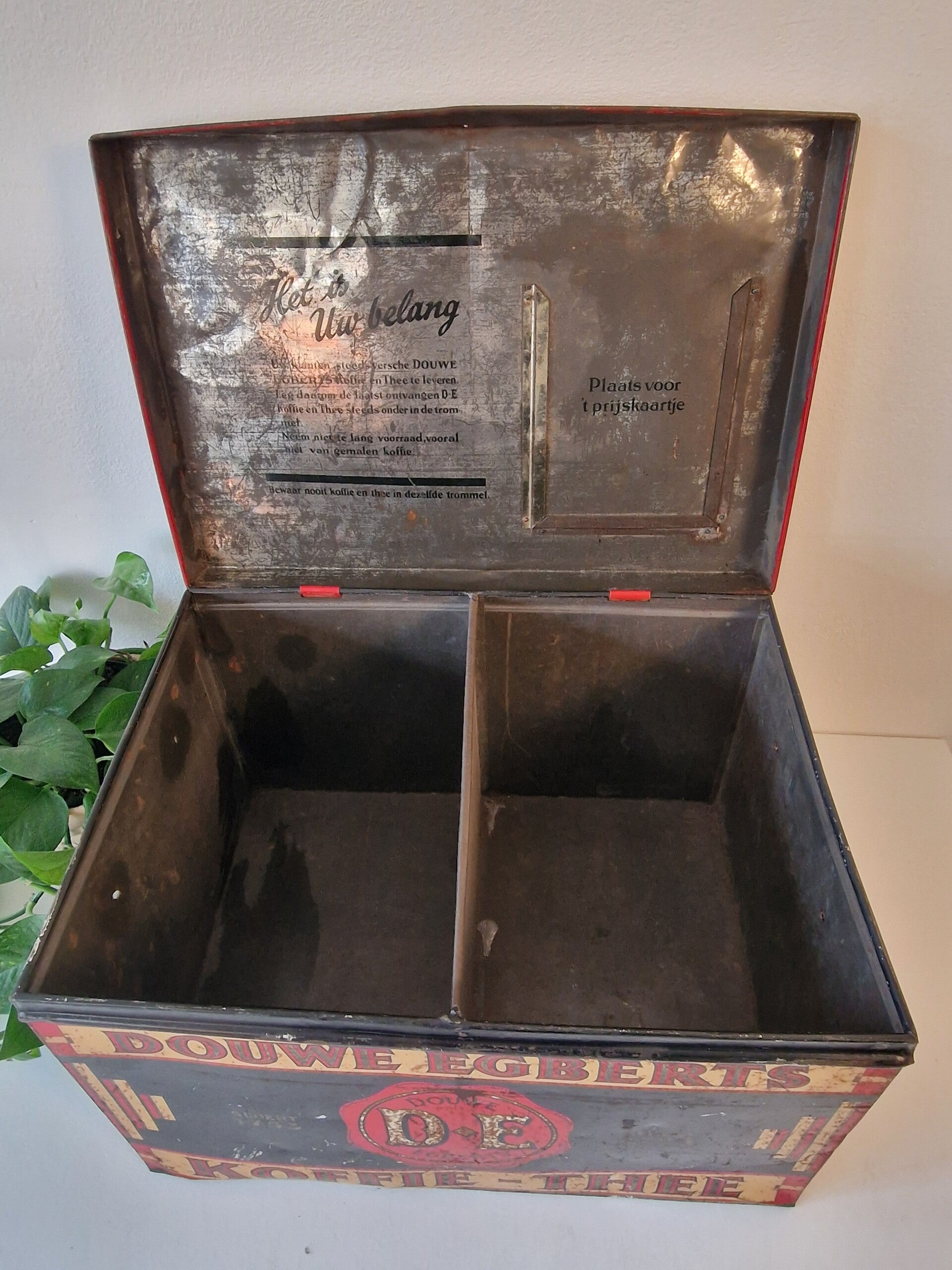 Een vintage voorraadblik met een karakteristieke scharnierende klep. Binnenin voorzien van twee compartimenten. Perfect voor het opbergen van voorraad of voor de opslag van verse koffiebonen en verse thee zoals hij vroeger werd gebruikt.