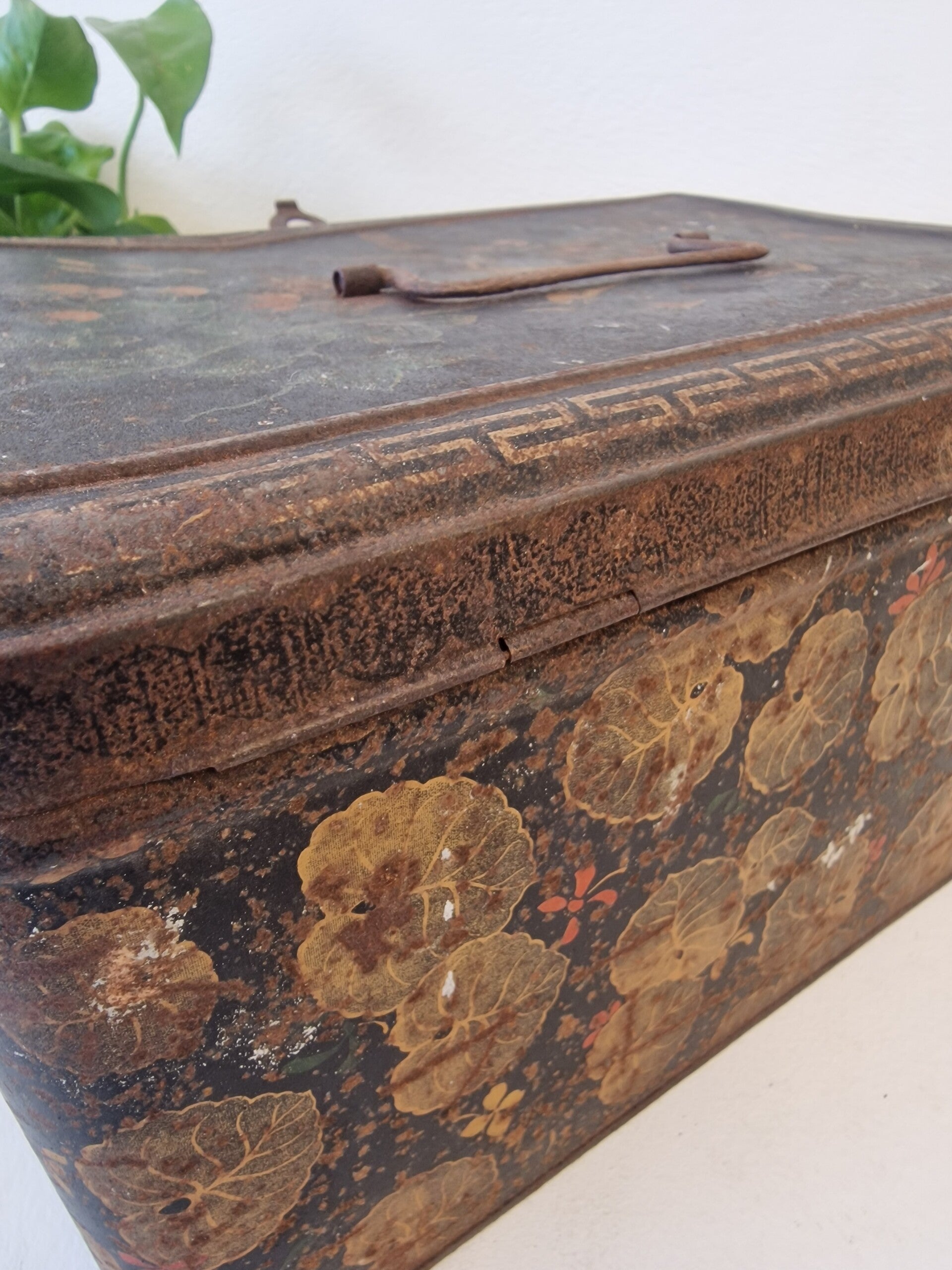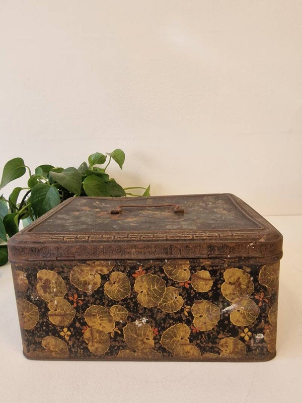 Een vintage metalen bewaarblik met een Oosterse uitstraling. Het ontwerp is geïnspireerd op traditioneel Japans lakwerk, met een diepzwarte basis versierd met een verfijnd patroon van goudkleurige bladeren en subtiele bloemaccenten. Op het deksel staat een afbeelding van een pauw.